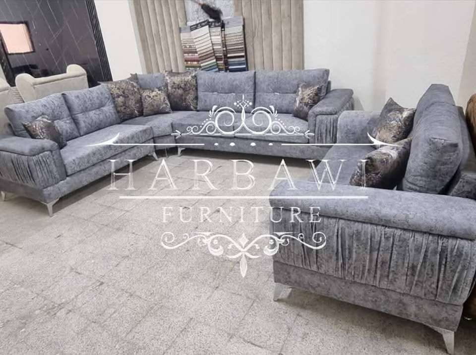 اطقم كنب وكورنر خشب سويد وزان اسفنج دانلوب قماش واتربروف مكفول3سنوات امكانيه تغيير اللون حسب الطلب