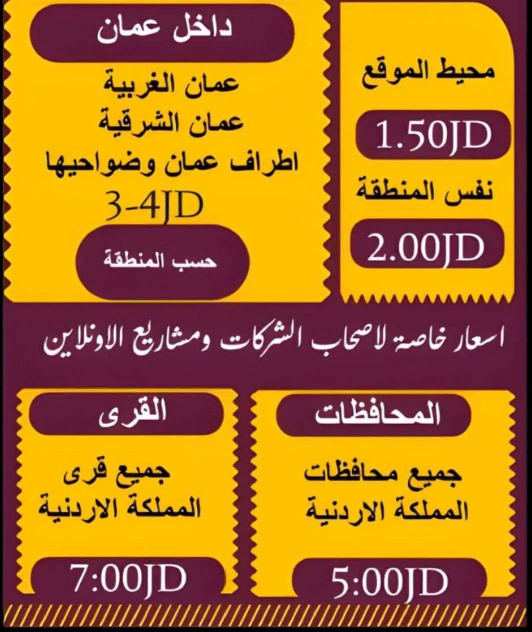 نقدّم لكم خدمة نقل ركاب وتوصيل أوردرات وأمانات باحترافية عالية، تشمل إربد، عمّان، الزرقاء، المفرق، العقبة وجميع محافظات الأردن، مع الالتزام بالمواعيد والراحة والأمان.
